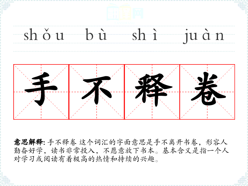 手不释卷 这个词汇的字面意思是手不离开书卷,形容人勤奋好学,读书非常投入,不愿意放下书本。基本含义是指一个人对学*或阅读有着极高的热情和持续的兴趣。