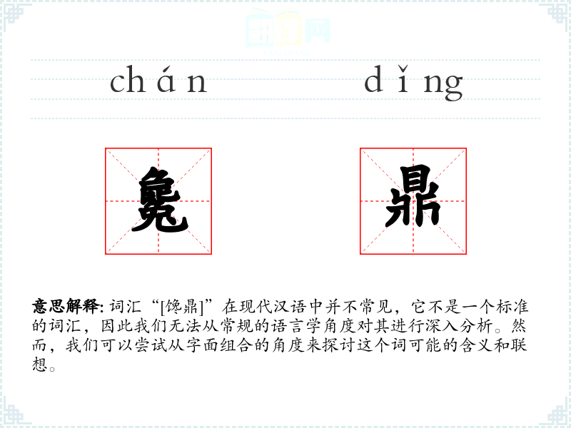 “馋”通常指对食物的强烈欲望或贪婪,而“鼎”在**文化中通常指古代的一种大型烹饪器具,也是权力的象征,如“九鼎”代表国家的重器。因此,“馋鼎”字面意思可能是对某种珍贵或重要物品的贪婪欲望。