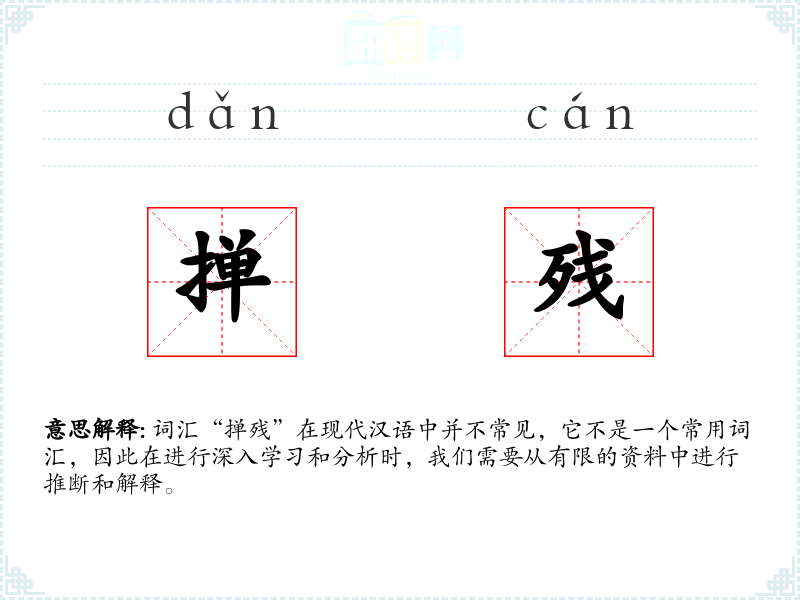 词汇“掸残”在现代汉语中并不常见,它不是一个常用词汇,因此在进行深入学习和分析时,我们需要从有限的资料中进行推断和解释。