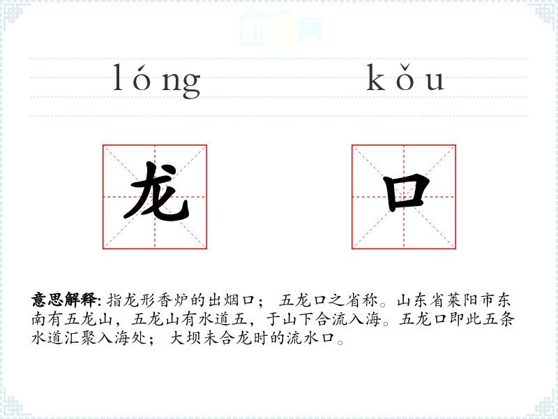 指龙形香炉的出烟口; 五龙口之省称。山东省莱阳市东南有五龙山,五龙山有水道五,于山下合流入海。五龙口即此五条水道汇聚入海处; 大坝未合龙时的流水口。
