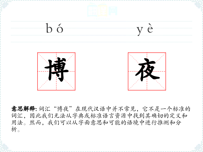 词汇“博夜”在现代汉语中并不常见,它不是一个标准的词汇,因此我们无法从字典或标准语言资源中找到其确切的定义和用法。然而,我们可以从字面意思和可能的语境中进行推测和分析。