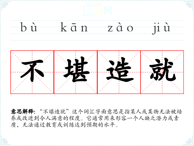 “不堪造就”这个词汇字面意思是指某人或某物无法被培养或改进到令人满意的程度。它通常用来形容一个人缺乏潜力或素质,无法通过教育或训练达到预期的水平。