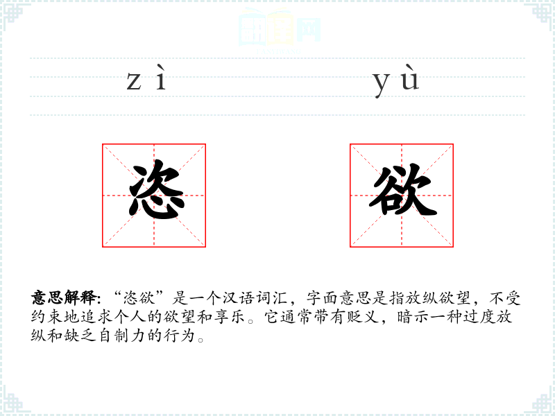 “恣欲”是一个汉语词汇,字面意思是指放纵欲望,不受约束地追求个人的欲望和享乐。它通常带有贬义,暗示一种过度放纵和缺乏自制力的行为。