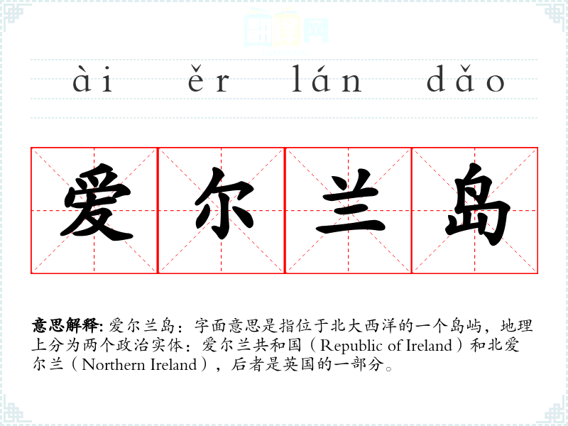 爱尔兰岛:字面意思是指位于北大西洋的一个岛屿,地理上分为两个政治实体:爱尔兰共和国(Republic of Ireland)和北爱尔兰(Northern Ireland),后者是英国的一部分。