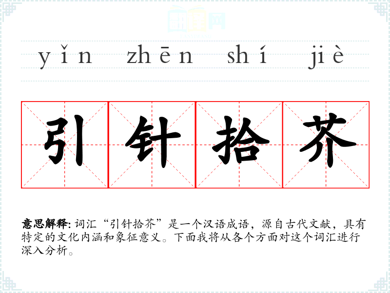 词汇“引针拾芥”是一个汉语成语,源自古代文献,具有特定的文化内涵和象征意义。下面我将从各个方面对这个词汇进行深入分析。