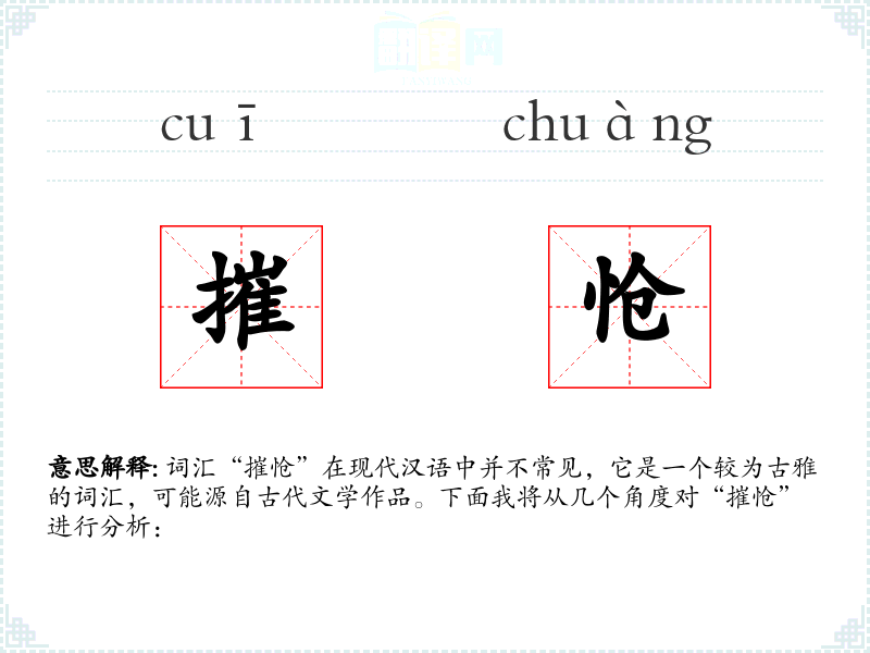 词汇“摧怆”在现代汉语中并不常见,它是一个较为古雅的词汇,可能源自古代文学作品。下面我将从几个角度对“摧怆”进行分析: