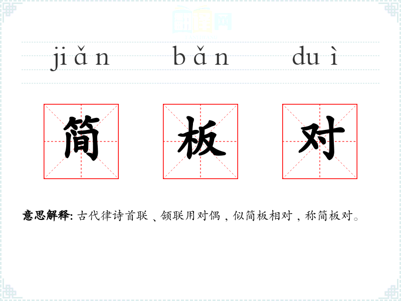 古代律诗首联﹑颔联用对偶﹐似简板相对﹐称简板对。