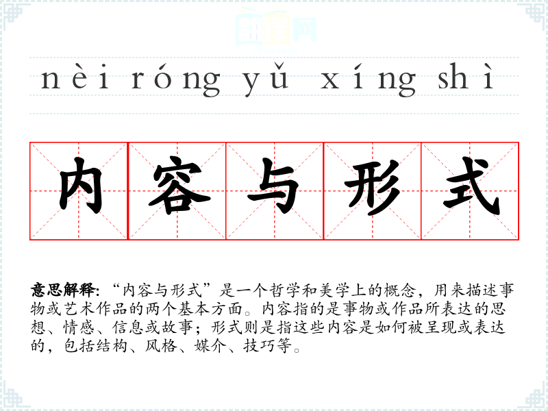 - 反义词:内容与形式本身并不是对立的,但可以说内容与装饰(内容是实质,装饰是表面的美化)