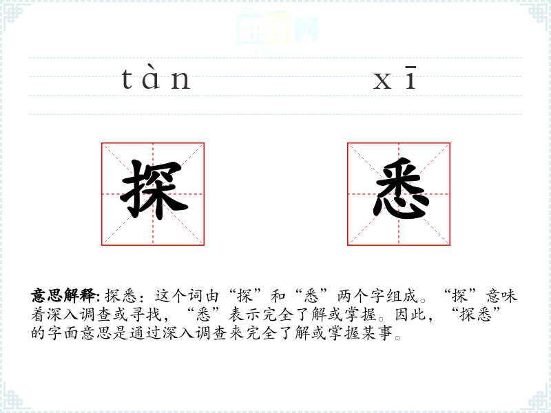 探悉:这个词由“探”和“悉”两个字组成。“探”意味着深入调查或寻找,“悉”表示完全了解或掌握。因此,“探悉”的字面意思是通过深入调查来完全了解或掌握某事。