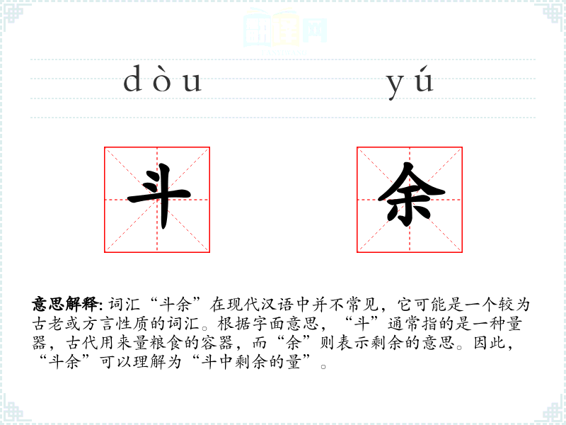 词汇“斗余”在现代汉语中并不常见,它可能是一个较为古老或方言性质的词汇。根据字面意思,“斗”通常指的是一种量器,古代用来量粮食的容器,而“余”则表示剩余的意思。因此,“斗余”可以理解为“斗中剩余的量”。