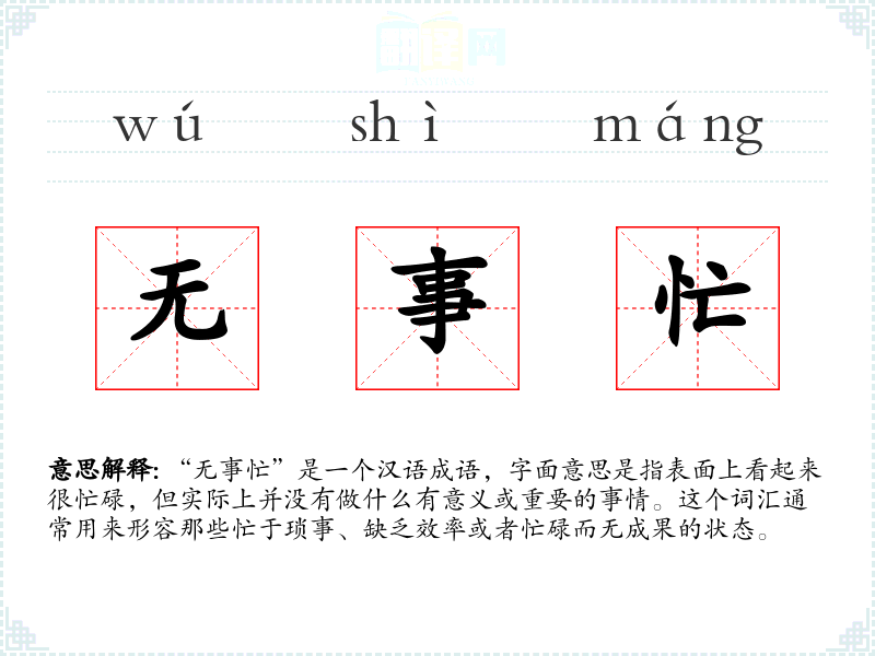 “无事忙”是一个汉语成语,字面意思是指表面上看起来很忙碌,但实际上并没有做什么有意义或重要的事情。这个词汇通常用来形容那些忙于琐事、缺乏效率或者忙碌而无成果的状态。
