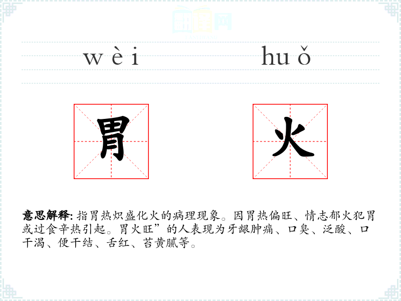 指胃热炽盛化火的病理现象。因胃热偏旺、情志郁火犯胃或过食辛热引起。胃火旺”的人表现为牙龈肿痛、口臭、泛酸、口干渴、便干结、舌红、苔黄腻等。