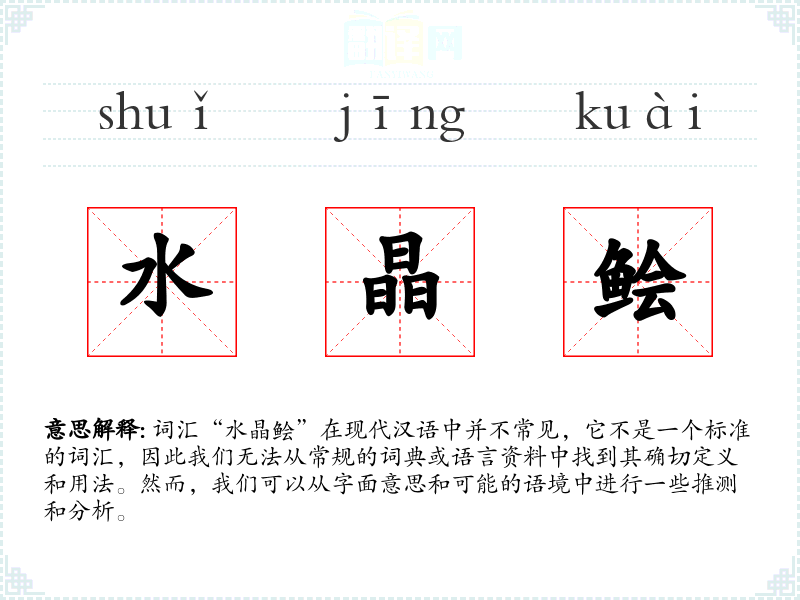 “水晶鲙”由“水晶”和“鲙”两个词组成。“水晶”通常指的是一种透明或半透明的矿物,具有高度的透明度和光泽,常用于装饰或制作首饰。“鲙”字在现代汉语中不常用,可能是“鲙鱼”的简称,指的是一种鱼类。因此,“水晶鲙”可能指的是一种透明或半透明的鱼类,或者是一种与水晶相关的鱼类制品。