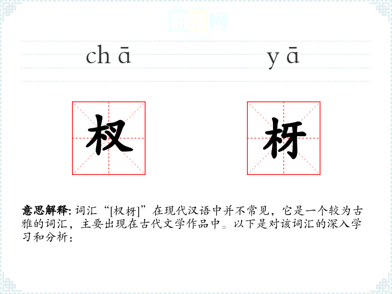 词汇“[杈枒]”在现代汉语中并不常见,它是一个较为古雅的词汇,主要出现在古代文学作品中。以下是对该词汇的深入学习和分析: