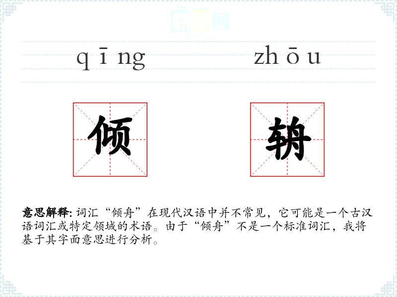 词汇“倾舟”在现代汉语中并不常见,它可能是一个古汉语词汇或特定领域的术语。由于“倾舟”不是一个标准词汇,我将基于其字面意思进行分析。