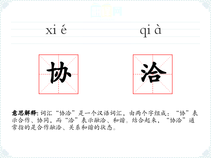 “协洽”的字面意思是合作并且融洽,通常用来描述人际关系、组织间的合作或工作环境中的和谐状态。
