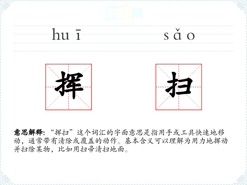 “挥扫”这个词汇的字面意思是指用手或工具快速地移动,通常带有清除或覆盖的动作。基本含义可以理解为用力地挥动并扫除某物,比如用扫帚清扫地面。