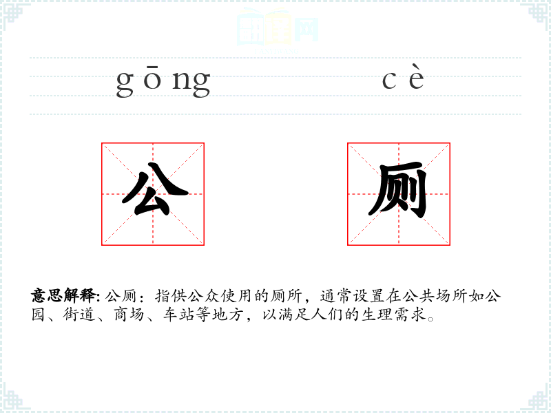 公厕一词由“公”和“厕”组成,“公”指公共的,“厕”指厕所。在古代,厕所多为私人所有,随着城市化的发展,公共厕所逐渐普及。