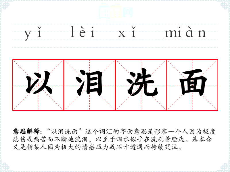 “以泪洗面”这个词汇的字面意思是形容一个人因为极度悲伤或痛苦而不断地流泪,以至于泪水似乎在洗刷着脸庞。基本含义是指某人因为极大的情感压力或不幸遭遇而持续哭泣。