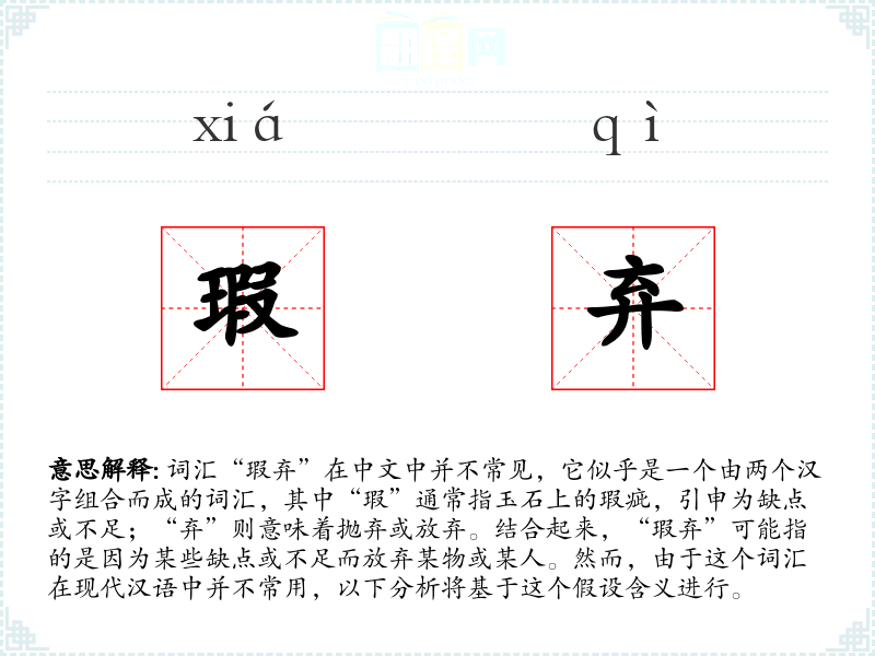 词汇“瑕弃”在中文中并不常见,它似乎是一个由两个汉字组合而成的词汇,其中“瑕”通常指玉石上的瑕疵,引申为缺点或不足;“弃”则意味着抛弃或放弃。结合起来,“瑕弃”可能指的是因为某些缺点或不足而放弃某物或某人。然而,由于这个词汇在现代汉语中并不常用,以下分析将基于这个假设含义进行。