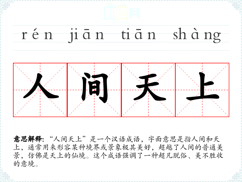 “人间天上”是一个汉语成语,字面意思是指人间和天上,通常用来形容某种境界或景象极其美好,超越了人间的普通美景,仿佛是天上的仙境。这个成语强调了一种超凡脱俗、美不胜收的意境。