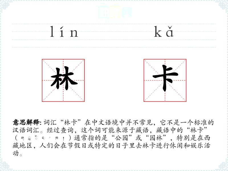 词汇“林卡”在中文语境中并不常见,它不是一个标准的汉语词汇。经过查询,这个词可能来源于藏语,藏语中的“林卡”(གླིང་ཁ།)通常指的是“公园”或“园林”,特别是在**地区,人们会在节假日或特定的日子里去林卡进行休闲和娱乐活动。