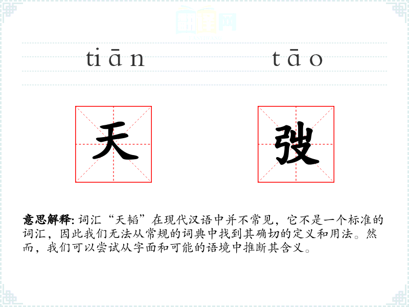 词汇“天韬”在现代汉语中并不常见,它不是一个标准的词汇,因此我们无法从常规的词典中找到其确切的定义和用法。然而,我们可以尝试从字面和可能的语境中推断其含义。