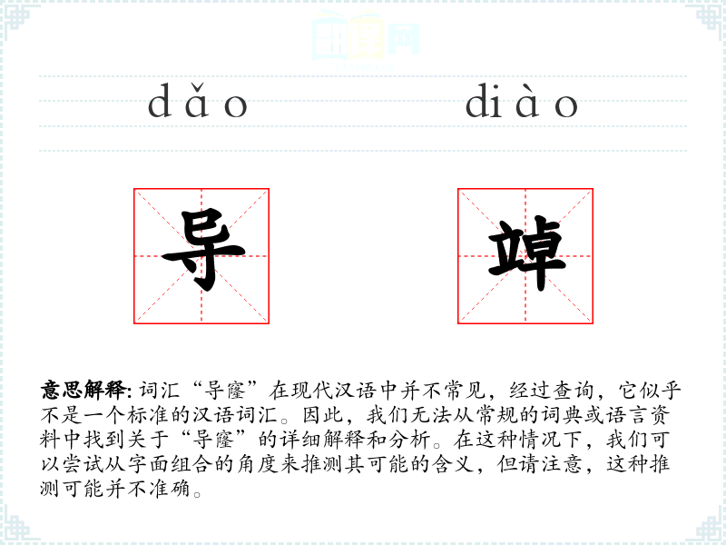 词汇“导窿”在现代汉语中并不常见,经过查询,它似乎不是一个标准的汉语词汇。因此,我们无法从常规的词典或语言资料中找到关于“导窿”的详细解释和分析。在这种情况下,我们可以尝试从字面组合的角度来推测其可能的含义,但请注意,这种推测可能并不准确。