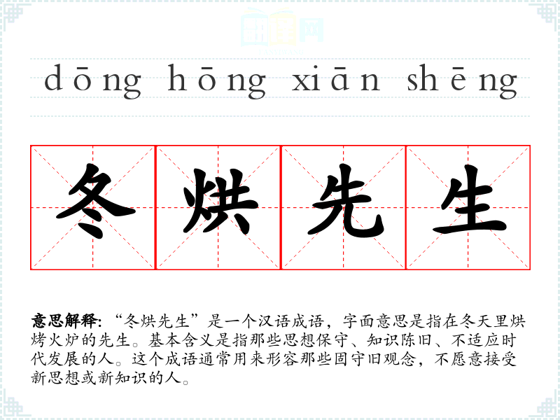“冬烘先生”是一个汉语成语,字面意思是指在冬天里烘烤火炉的先生。基本含义是指那些思想保守、知识陈旧、不适应时代发展的人。这个成语通常用来形容那些固守旧观念,不愿意接受新思想或新知识的人。