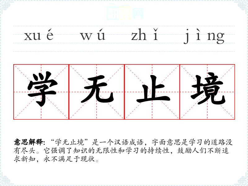 “学无止境”是一个汉语成语,字面意思是学的道路没有尽头。它强调了知识的无限性和学的持续性,鼓励人们不断追求新知,永不满足于现状。
