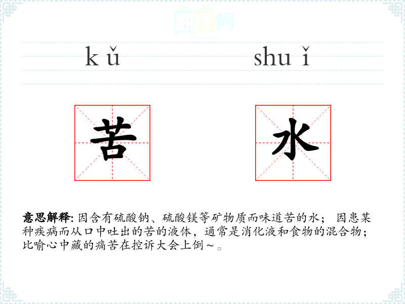 因含有硫酸钠、硫酸镁等矿物质而味道苦的水; 因患某种疾病而从口中吐出的苦的液体,通常是消化液和食物的混合物; 比喻心中藏的痛苦在控诉大会上倒~。