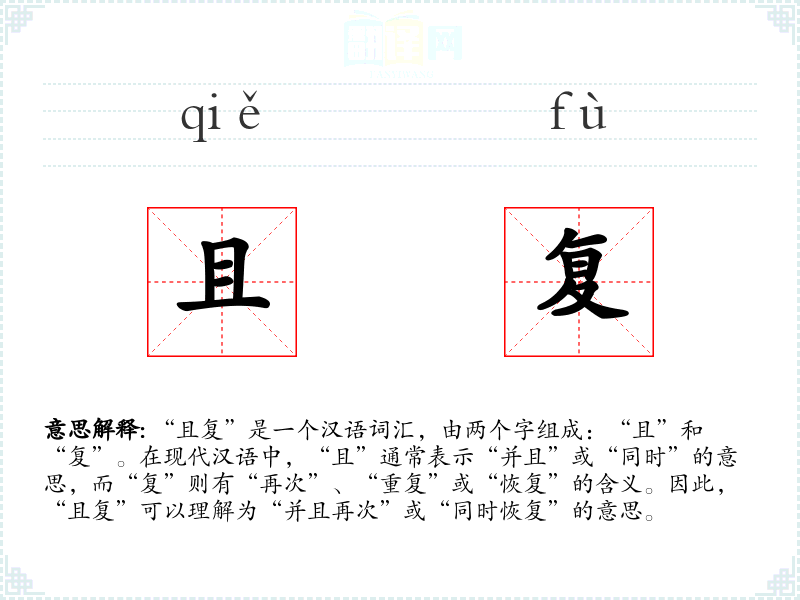 “且复”是一个汉语词汇,由两个字组成:“且”和“复”。在现代汉语中,“且”通常表示“并且”或“同时”的意思,而“复”则有“再次”、“重复”或“恢复”的含义。因此,“且复”可以理解为“并且再次”或“同时恢复”的意思。