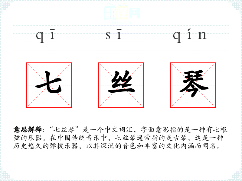 “七丝琴”是一个中文词汇,字面意思指的是一种有七根弦的乐器。在**传统音乐中,七丝琴通常指的是古琴,这是一种历史悠久的弹拨乐器,以其深沉的音色和丰富的文化内涵而闻名。