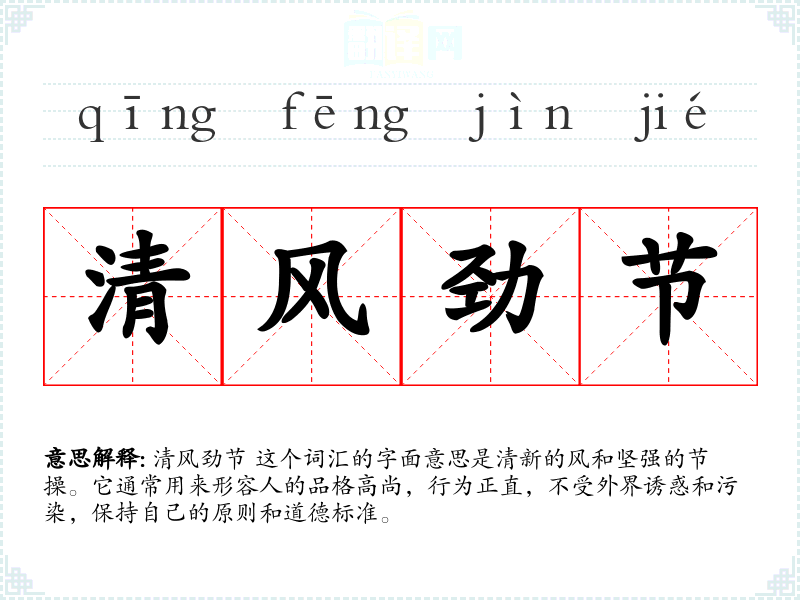 清风劲节 这个词汇的字面意思是清新的风和坚强的节操。它通常用来形容人的品格高尚,行为正直,不受外界诱惑和污染,保持自己的原则和道德标准。