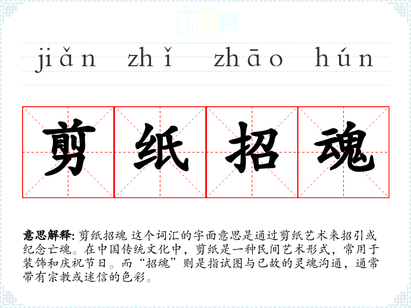 “剪纸招魂”这个词汇不仅代表了一种传统的艺术形式和*仪式,还承载了深厚的文化意义和情感价值。在语言学和表达中,理解和运用这样的词汇可以帮助我们更好地把握和传达复杂的情感和文化背景。