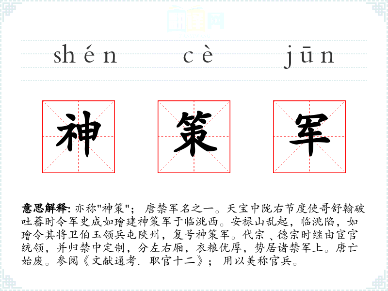1.亦称"神策"; 唐禁军名之一。天宝中陇右节度使哥舒翰破吐蕃时令军史成如璯建神策军于临洮西。安禄山乱起,临洮陷,如璯令其将卫伯玉领兵屯陕州,复号神策军。代宗﹑德宗时继由宦官统领,并归禁中定制,分左右厢,衣粮优厚,势居诸禁军上。唐亡始废。参阅《文献通考.职官十二》; 用以美称官兵。