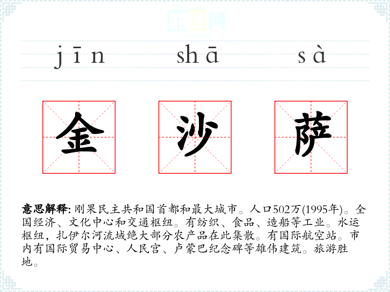 1.刚果民主共和国首都和最大城市。人口502万(1995年)。全国经济、文化中心和交通枢纽。有纺织、食品、造船等工业。水运枢纽,扎伊尔河流域绝大部分农产品在此集散。有国际航空站。市内有国际贸易中心、人民宫、卢蒙巴纪念碑等雄伟建筑。旅游胜地。