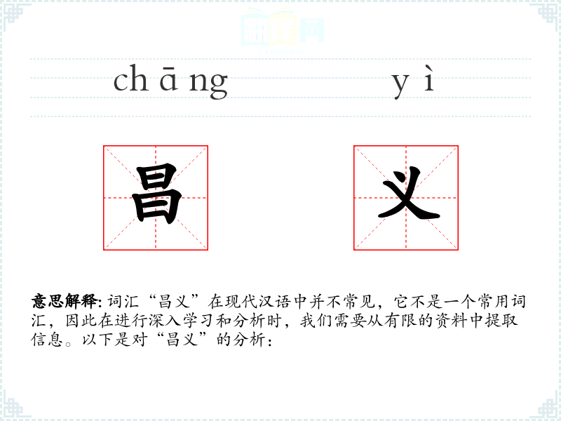 “昌义”的词源较为简单,是由“昌”和“义”两个汉字组合而成。在古代文献中,可能会有使用“昌义”来表达对正义和繁荣的追求的例子,但在现代汉语中,这个词的使用频率较低。