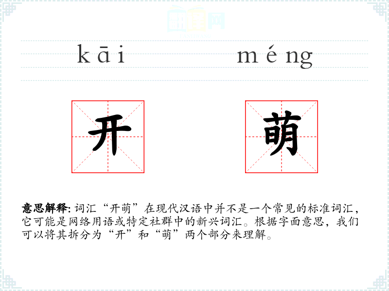 - 词源:“开萌”可能是由“开”和“萌”两个词组合而成的新词,源自网络文化,特别是动漫和游戏社群。