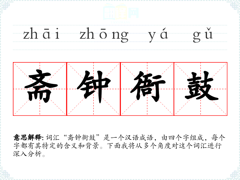 词汇“斋钟衙鼓”是一个汉语成语,由四个字组成,每个字都有其特定的含义和背景。下面我将从多个角度对这个词汇进行深入分析。