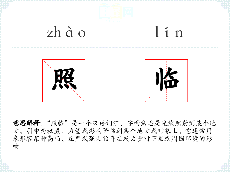 “照临”由“照”和“临”两个字组成。“照”字古已有之,意为光线照射;“临”字原意为从高处向下看,后引申为到来、降临。两个字组合后,形成了现在的含义。