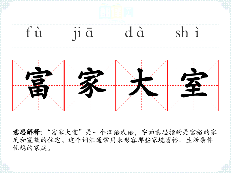 “富家大室”是一个汉语成语,字面意思指的是富裕的家庭和宽敞的住宅。这个词汇通常用来形容那些家境富裕、生活条件优越的家庭。