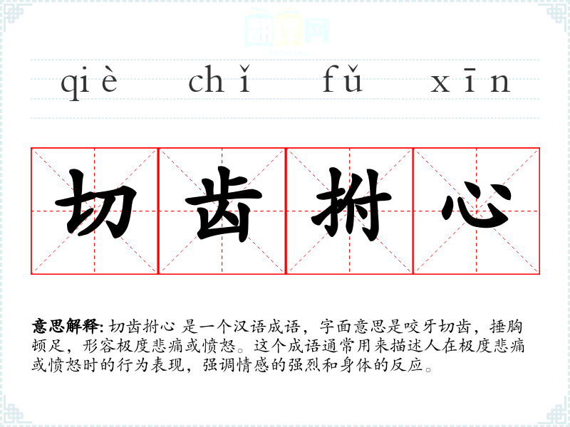 切齿拊心 是一个汉语成语,字面意思是咬牙切齿,捶胸顿足,形容极度悲痛或愤怒。这个成语通常用来描述人在极度悲痛或愤怒时的行为表现,强调情感的强烈和身体的反应。