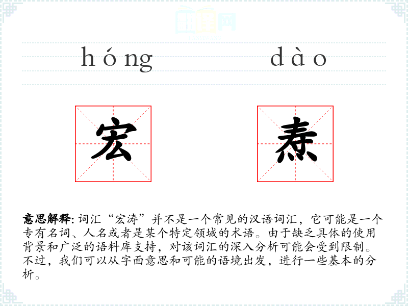 词汇“宏涛”并不是一个常见的汉语词汇,它可能是一个专有名词、人名或者是某个特定领域的术语。由于缺乏具体的使用背景和广泛的语料库支持,对该词汇的深入分析可能会受到限制。不过,我们可以从字面意思和可能的语境出发,进行一些基本的分析。