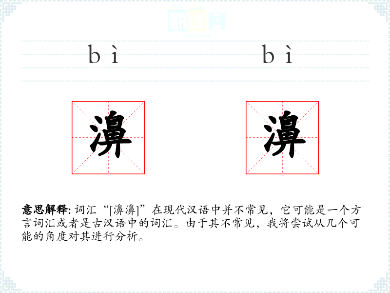 词汇“[濞濞]”在现代汉语中并不常见,它可能是一个方言词汇或者是古汉语中的词汇。由于其不常见,我将尝试从几个可能的角度对其进行分析。