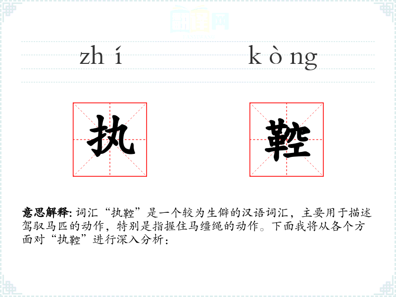 词汇“执鞚”是一个较为生僻的汉语词汇,主要用于描述驾驭马匹的动作,特别是指握住马缰绳的动作。下面我将从各个方面对“执鞚”进行深入分析: