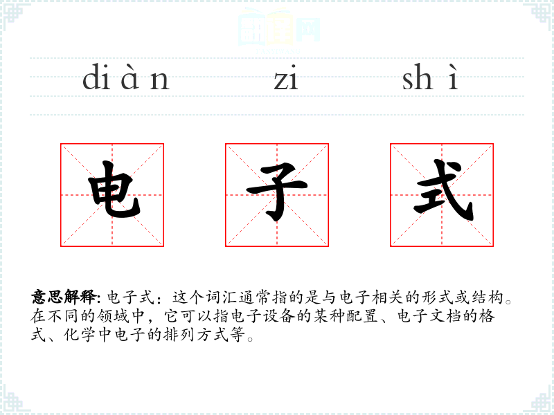 电子式:这个词汇通常指的是与电子相关的形式或结构。在不同的领域中,它可以指电子设备的某种配置、电子文档的格式、化学中电子的排列方式等。
