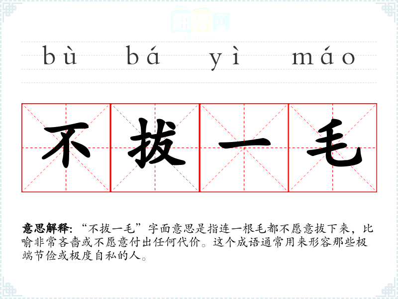“不拔一毛”字面意思是指连一根毛都不愿意拔下来,比喻非常吝啬或不愿意付出任何代价。这个成语通常用来形容那些极端节俭或极度自私的人。