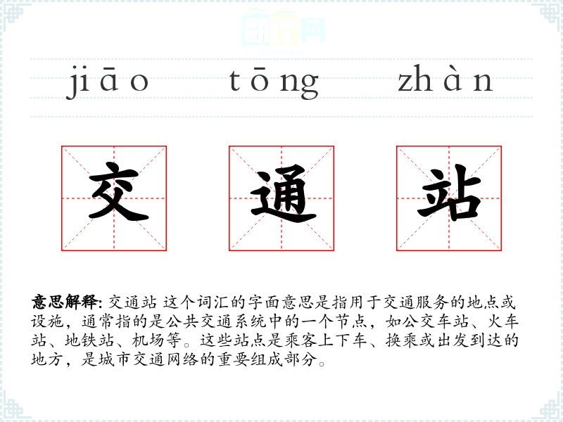 交通站 这个词汇的字面意思是指用于交通服务的地点或设施,通常指的是公共交通系统中的一个节点,如公交车站、火车站、地铁站、机场等。这些站点是乘客上下车、换乘或出发到达的地方,是城市交通网络的重要组成部分。