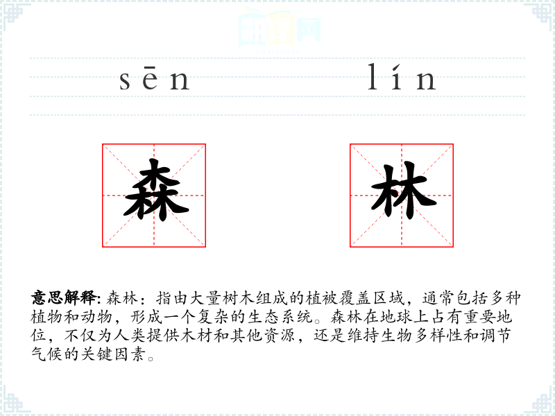 - 反义词:沙漠、草原。这些词汇指代缺乏树木的开放区域。